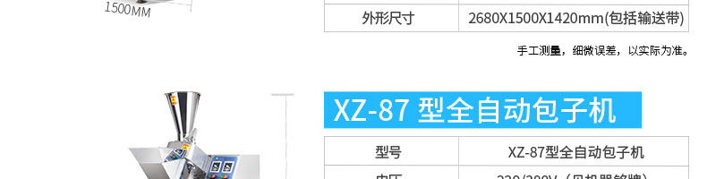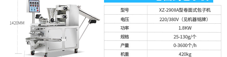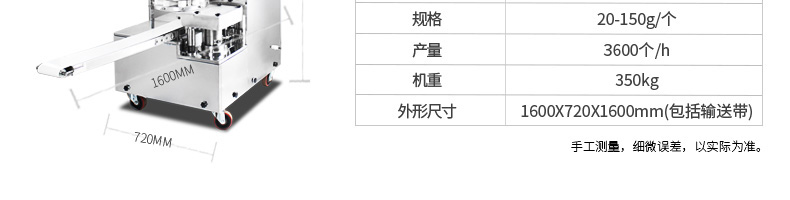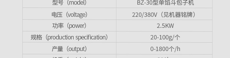 名稱BZ-30型單餡斗包子機 電源220/380V(見機器名牌) 功率2.5kw 產(chǎn)量1800個/小時 尺寸1440*680*1470mm 重量300kg 規(guī)格25-100克/個 其他