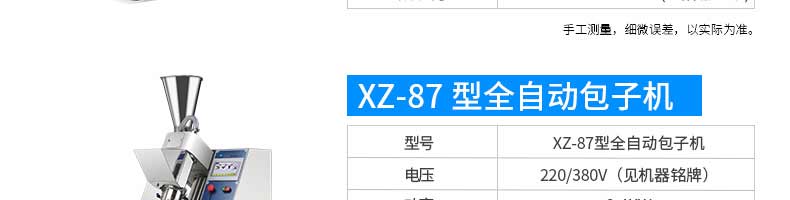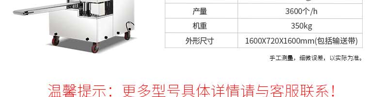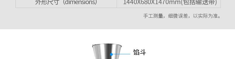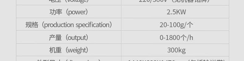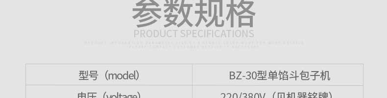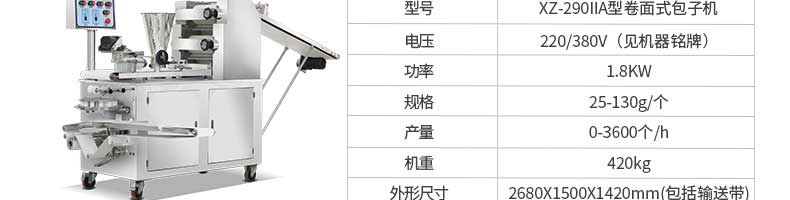 名稱旭眾30單餡斗包子機(jī) 電源220/380V(見機(jī)器名牌) 功率2.5kw 產(chǎn)量0-1800個(gè)/小時(shí) 尺寸1440*680*1420mm(包括輸送帶) 重量300KG 規(guī)格20-100克/個(gè) 其他