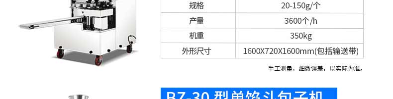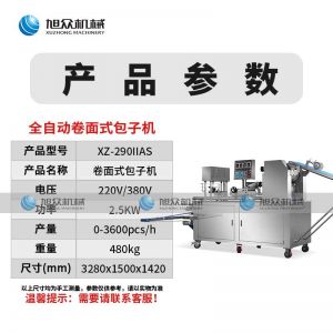 名稱290IIAS卷面式包子機(jī) 電源220/380V 功率2.5kw 產(chǎn)量0-3600個(gè)/h 尺寸3280×1500×1420mm 重量480KG 規(guī)格 其他
