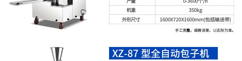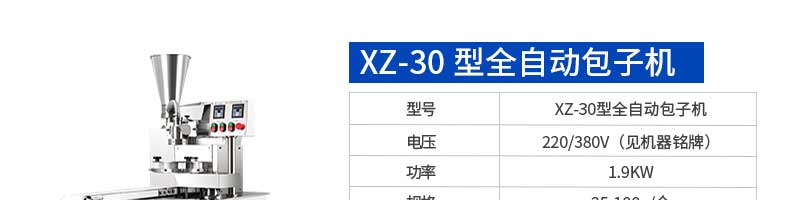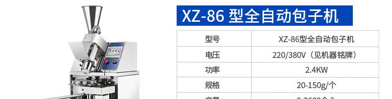 名稱XZ-85全自動包子機 電源220/380v 功率2.4kw 產(chǎn)量 尺寸1600*720*1600mm 重量350kg 規(guī)格20-150克/只 其他