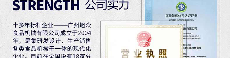 廣州旭眾食品機械有限公司是一家集科研開發(fā),生產(chǎn)設計,營銷服務為一體的現(xiàn)代化生產(chǎn)企業(yè)。現(xiàn)代化生產(chǎn)車間,精湛制造技術(shù),所產(chǎn)機械歷經(jīng)市場重重考驗,不斷贏得海內(nèi)外客戶的贊譽。