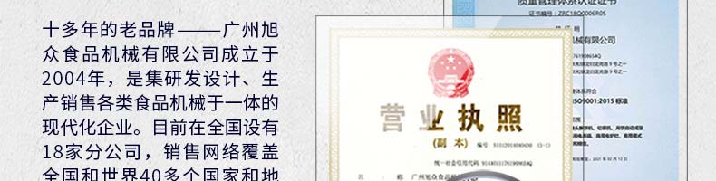 廣州旭眾食品機(jī)械有限公司是一家集科研開(kāi)發(fā),生產(chǎn)設(shè)計(jì),營(yíng)銷服務(wù)為一體的現(xiàn)代化生產(chǎn)企業(yè)。現(xiàn)代化生產(chǎn)車間,精湛制造技術(shù),所產(chǎn)機(jī)械歷經(jīng)市場(chǎng)重重考驗(yàn),不斷贏得海內(nèi)外客戶的贊譽(yù)。