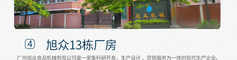 廣州旭眾食品機械有限公司是一家集科研開發(fā),生產(chǎn)設(shè)計,營銷服務為一體的現(xiàn)代化生產(chǎn)企業(yè)。現(xiàn)代化生產(chǎn)車間,精湛制造技術(shù),所產(chǎn)機械歷經(jīng)市場重重考驗,不斷贏得海內(nèi)外客戶的贊譽。