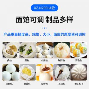 XZ-N290IIA卷面式包子機,壓面成型面皮,卷面方式包餡。仿手工捏花、一次成型、表面光滑、口感勁道。面餡可調(diào)、制品多樣。產(chǎn)品重量精度高,規(guī)格,大小,面皮的厚度皆可調(diào)控。