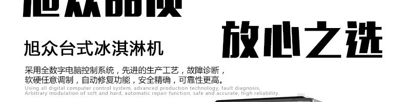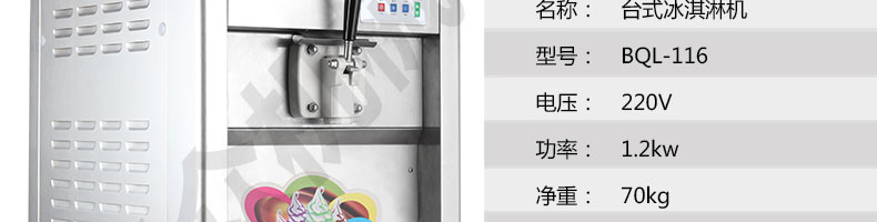 BQL-116臺式冰淇淋機,●選用國際名牌成熟制冷配套件和高效壓縮機,融合旭眾精湛工藝輔以嚴格的質(zhì)量控制流程,使產(chǎn)品整體性能及品質(zhì)得以全面提升?!癫捎萌珨?shù)字電腦控制系統(tǒng),選用名牌優(yōu)質(zhì)電器元件,先進的生產(chǎn)工藝,故障診斷,軟硬任意調(diào)制,自動修復(fù)功能,安全精確,可靠性更高。●專業(yè)成熟制冷系統(tǒng)設(shè)計,選用世界名牌大功率專用壓縮機,大大縮短冰淇淋成型時間,相同時間內(nèi)冰淇淋產(chǎn)量大幅度增加,使您生意火爆時依然得心應(yīng)手,為您創(chuàng)造財富?!癜踩椒€(wěn)的機械攪拌系統(tǒng),噪音更低、振動更小,使整機運行性能達到國際先進水平。●確保進料溫度在0°C~35°C;環(huán)境溫度5°C~40°C勻可正常使用。