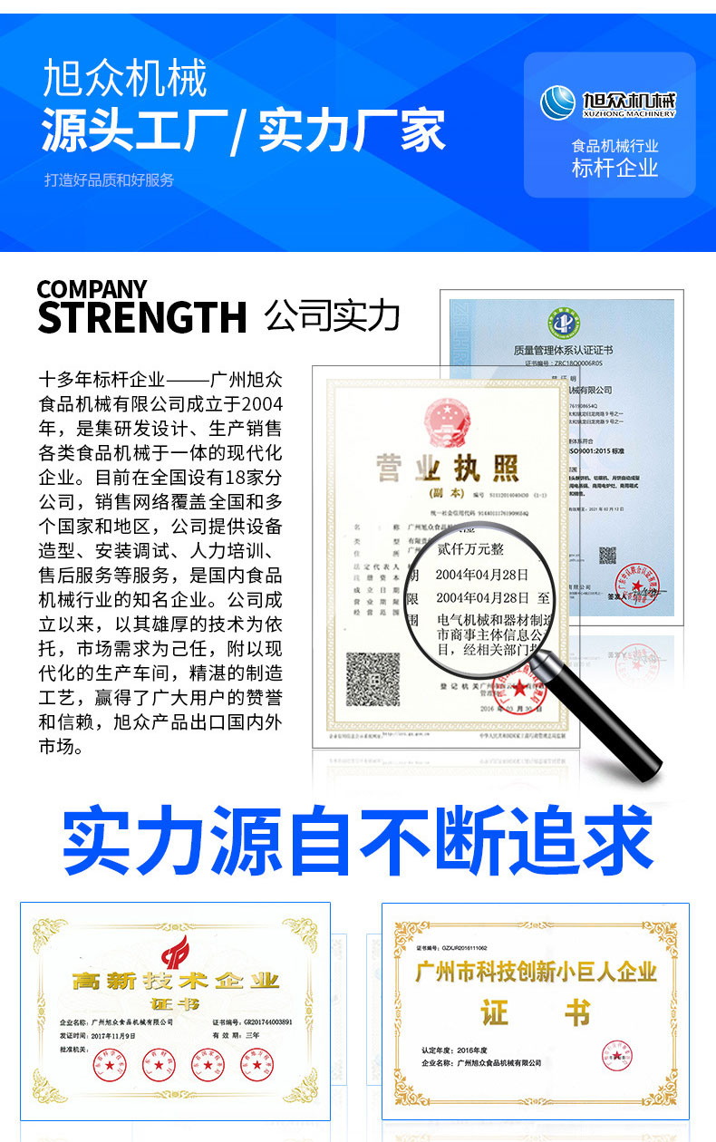 廣州旭眾食品機(jī)械有限公司是一家集科研開發(fā),生產(chǎn)設(shè)計,營銷服務(wù)為一體的現(xiàn)代化生產(chǎn)企業(yè)?,F(xiàn)代化生產(chǎn)車間,精湛制造技術(shù),所產(chǎn)機(jī)械歷經(jīng)市場重重考驗(yàn),不斷贏得海內(nèi)外客戶的贊譽(yù)。