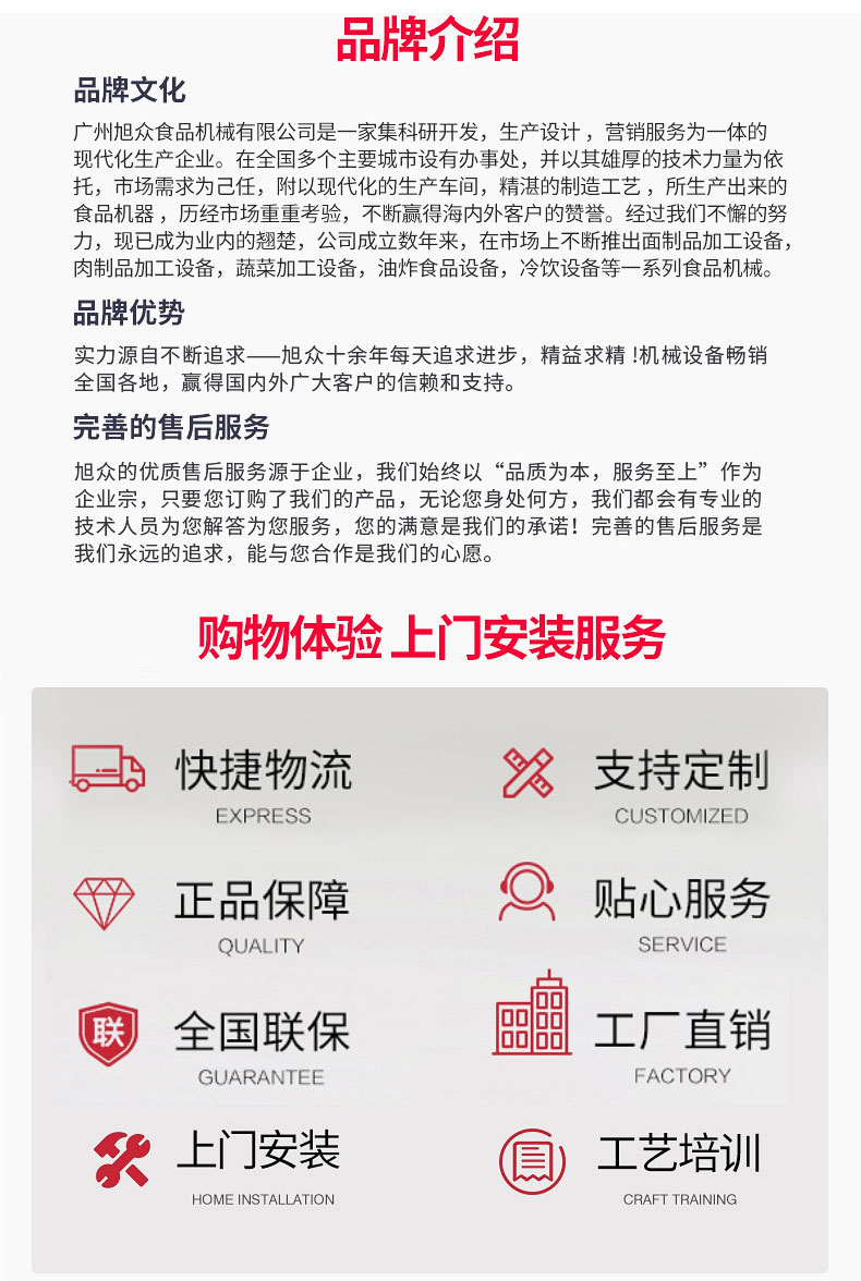 廣州旭眾食品機械有限公司是一家集科研開發(fā),生產(chǎn)設(shè)計,營銷服務(wù)為一體的現(xiàn)代化生產(chǎn)企業(yè)?,F(xiàn)代化生產(chǎn)車間,精湛制造技術(shù),所產(chǎn)機械歷經(jīng)市場重重考驗,不斷贏得海內(nèi)外客戶的贊譽。