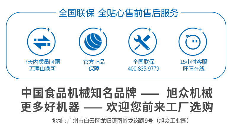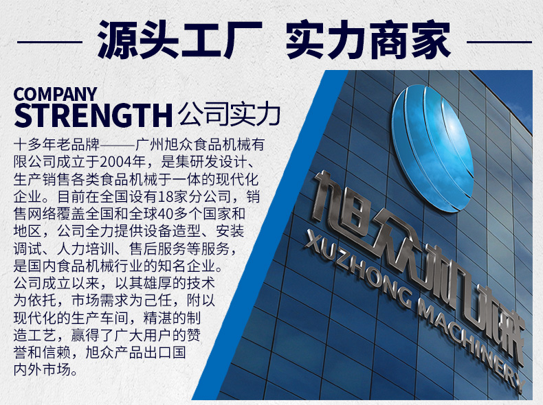 廣州旭眾食品機(jī)械有限公司是一家集科研開(kāi)發(fā),生產(chǎn)設(shè)計(jì),營(yíng)銷服務(wù)為一體的現(xiàn)代化生產(chǎn)企業(yè)。現(xiàn)代化生產(chǎn)車間,精湛制造技術(shù),所產(chǎn)機(jī)械歷經(jīng)市場(chǎng)重重考驗(yàn),不斷贏得海內(nèi)外客戶的贊譽(yù)。