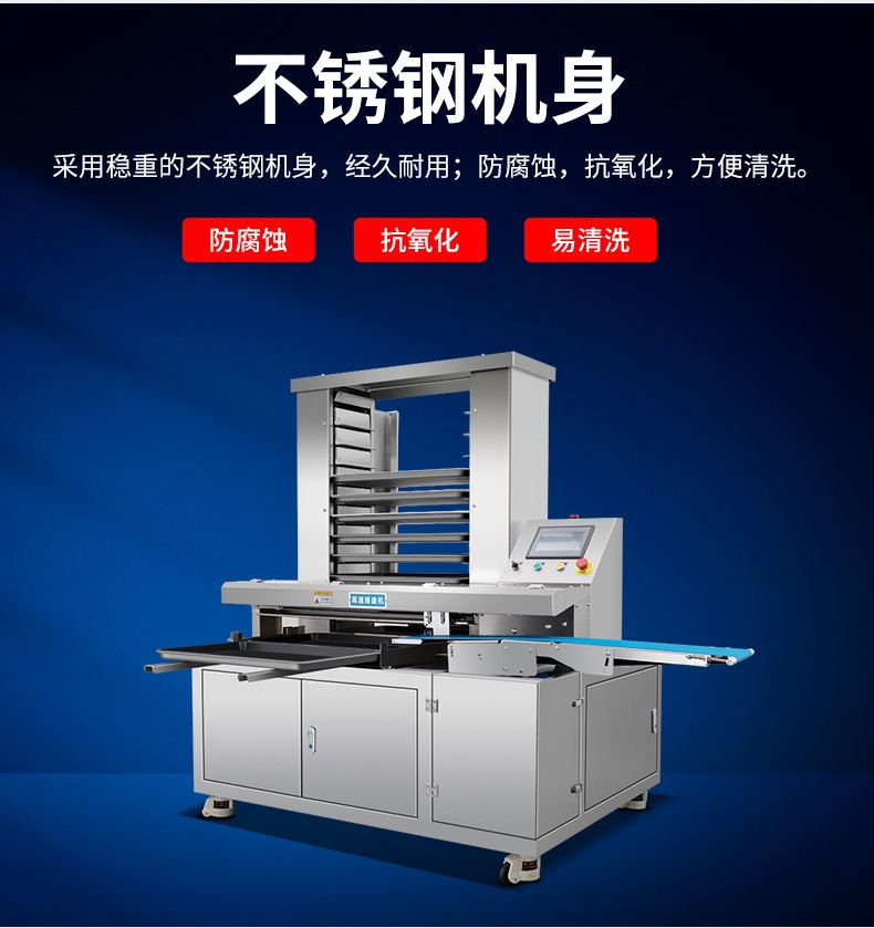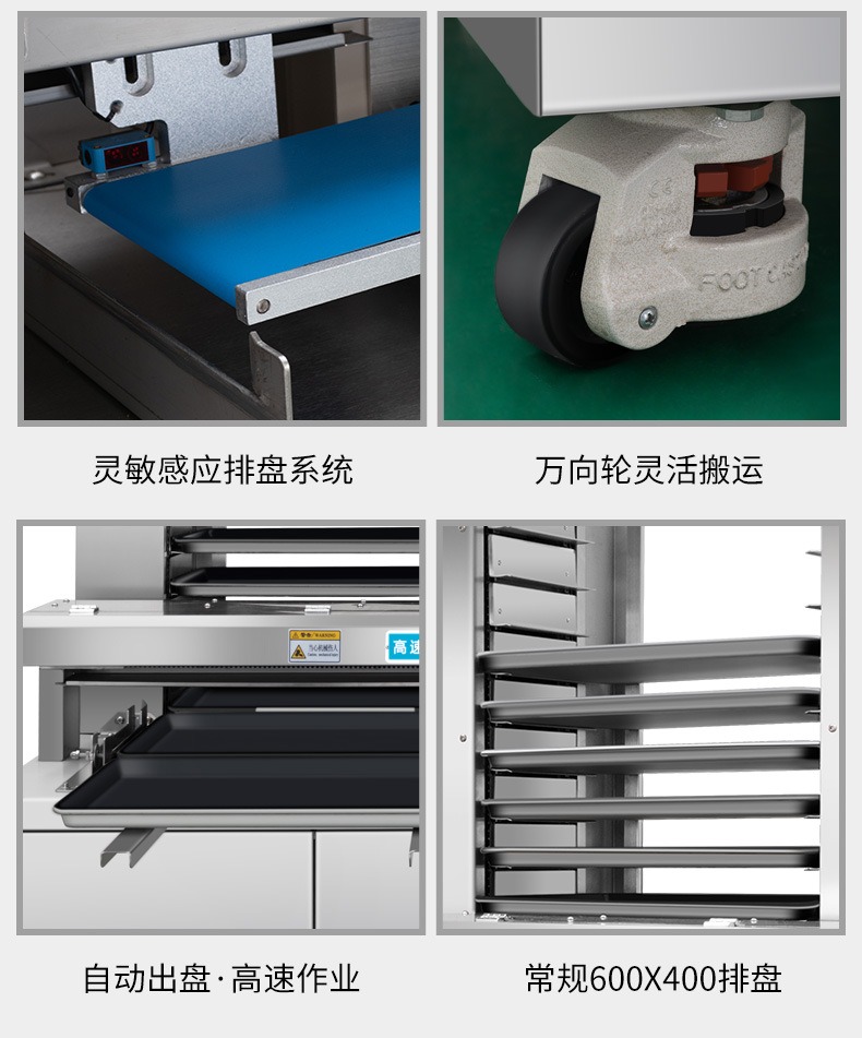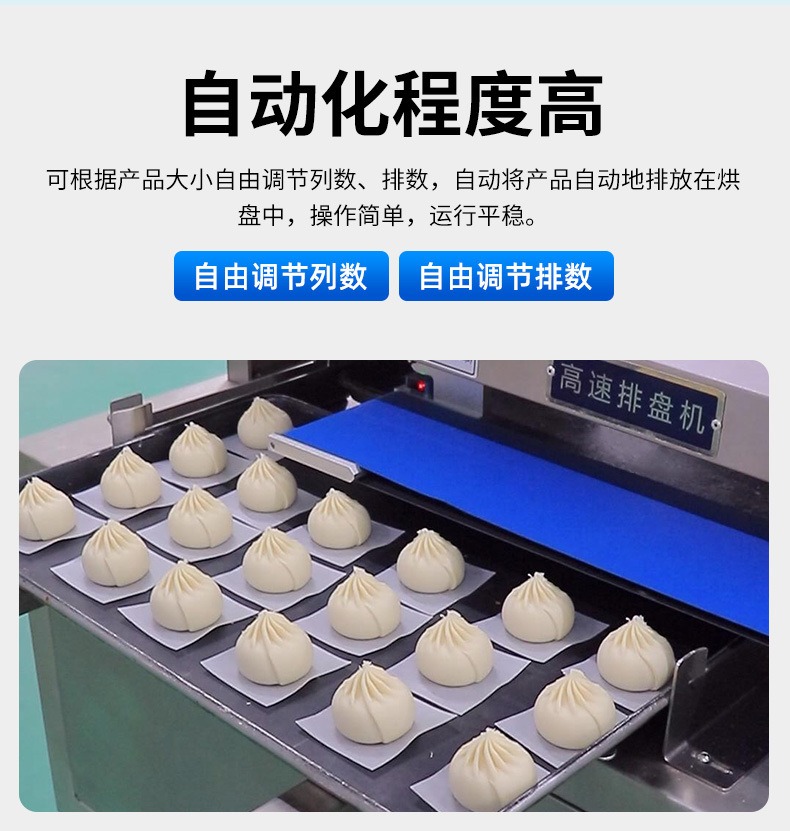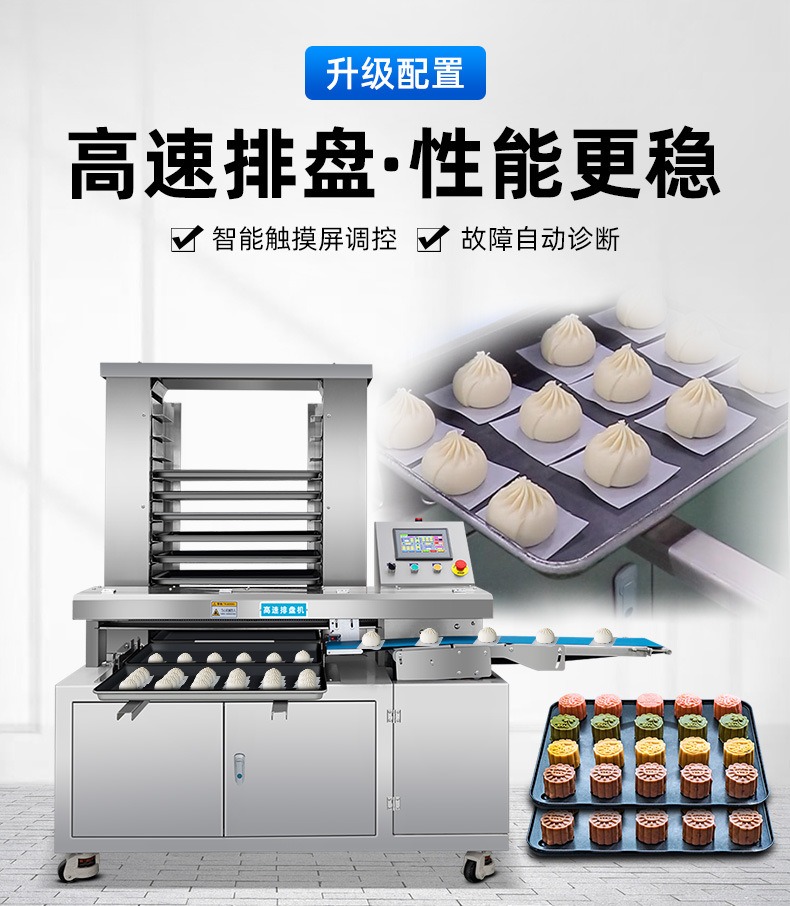 多功能商用高速排盤機,自動化程度高,可根據(jù)產(chǎn)品大小自由調(diào)節(jié)列數(shù)、排數(shù),自動將產(chǎn)品自動地排放在烘盤中,操作簡單,運行平穩(wěn)。智能觸屏面板??刂葡到y(tǒng)由三菱PLC和進口觸摸屏組成,操作簡單方便。具有故障自動診斷,一目了然。