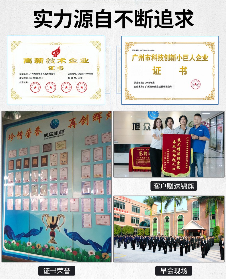 廣州旭眾食品機械有限公司是一家集科研開發(fā),生產(chǎn)設計,營銷服務為一體的現(xiàn)代化生產(chǎn)企業(yè)。現(xiàn)代化生產(chǎn)車間,精湛制造技術,所產(chǎn)機械歷經(jīng)市場重重考驗,不斷贏得海內(nèi)外客戶的贊譽。