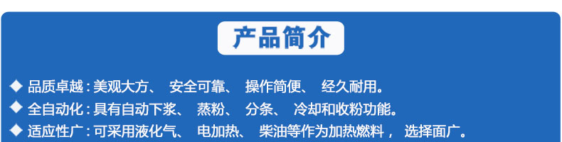 名稱SZ-HF-500高效節(jié)能河粉機 電源220V 功率1.1kw 產(chǎn)量240/300/400/500kg/h 尺寸主機尺寸7500*1000*1050mm 外形尺寸7600*1200*1500mm 重量650kg 規(guī)格粉條寬度mm:4/6/8/10 其他