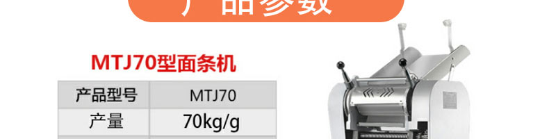 名稱(chēng)70型全自動(dòng)壓面面條機(jī) 電源380v 功率2.2kw 產(chǎn)量70kg/g 尺寸900*650*1200mm 重量170kg 規(guī)格 其他
