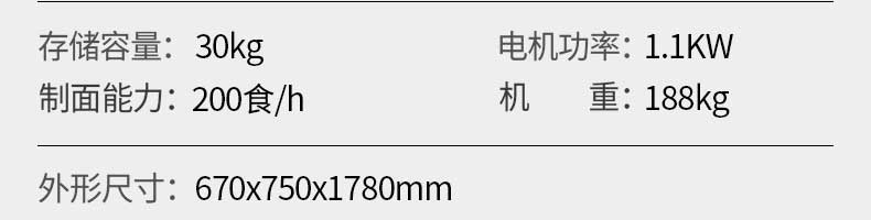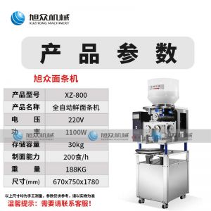 名稱XZ-800全自動鮮面條機 電源220V 功率電機功率:11KW 產量制面能力:200食/h 尺寸670X750X1780mm 重量188kg 規(guī)格聯(lián)系銷售員 其他存儲容量:30kg