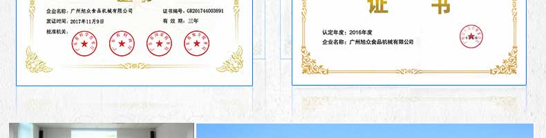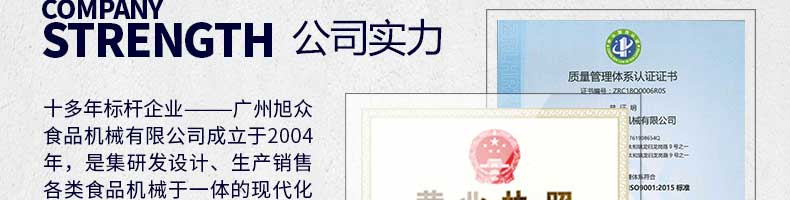 廣州旭眾食品機械有限公司是一家集科研開發(fā),生產設計,營銷服務為一體的現(xiàn)代化生產企業(yè)?,F(xiàn)代化生產車間,精湛制造技術,所產機械歷經市場重重考驗,不斷贏得海內外客戶的贊譽。