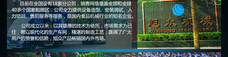 廣州旭眾食品機(jī)械有限公司是一家集科研開發(fā),生產(chǎn)設(shè)計,營銷服務(wù)為一體的現(xiàn)代化生產(chǎn)企業(yè)?,F(xiàn)代化生產(chǎn)車間,精湛制造技術(shù),所產(chǎn)機(jī)械歷經(jīng)市場重重考驗,不斷贏得海內(nèi)外客戶的贊譽(yù)。