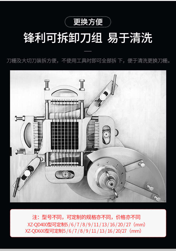 XZ-QD400切丁機,替您排憂解難全自動商用切丁機切片、切絲、切丁,功能強大,滿足您的使用需求。多功能&實用人即可操作,切出自己想要的規(guī)格,滿足商用多種需求。