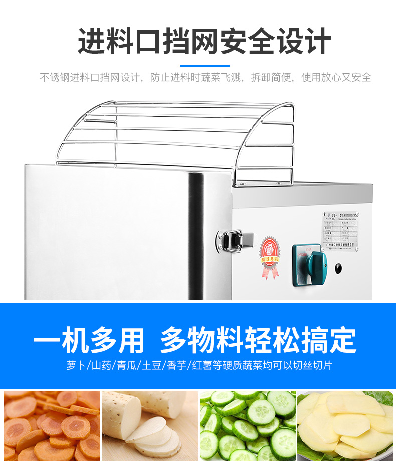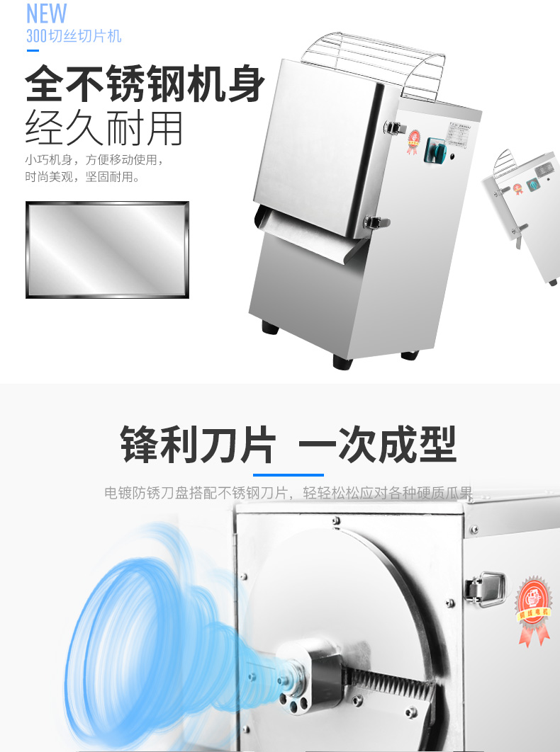 300型瓜果切絲切片機,高效便捷、一次成型、每小時可切200-300KG。全不銹鋼機身經久耐用小巧機身,方便移動使用,時尚美觀,堅固耐用。鋒利刀片、一次成型。電鍍防銹刀盤搭配不銹鋼刀片,輕輕松松應對各種硬質瓜果。