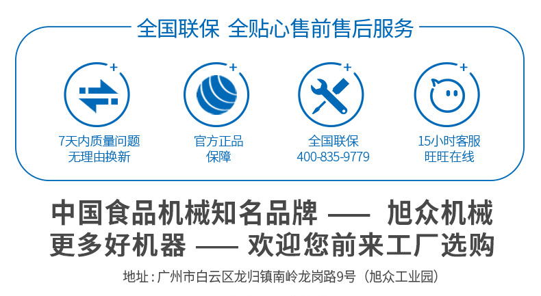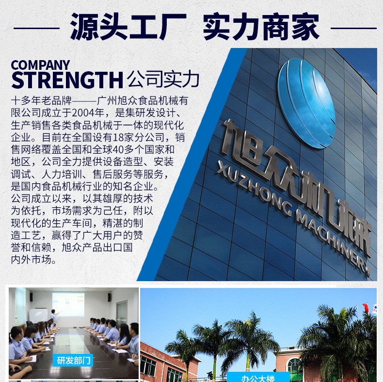 廣州旭眾食品機械有限公司是一家集科研開發(fā),生產設計,營銷服務為一體的現(xiàn)代化生產企業(yè)?,F(xiàn)代化生產車間,精湛制造技術,所產機械歷經市場重重考驗,不斷贏得海內外客戶的贊譽。