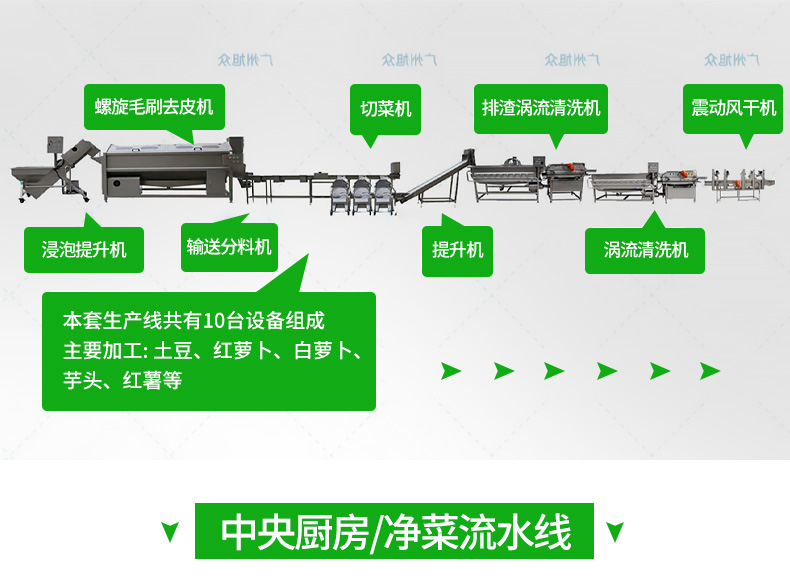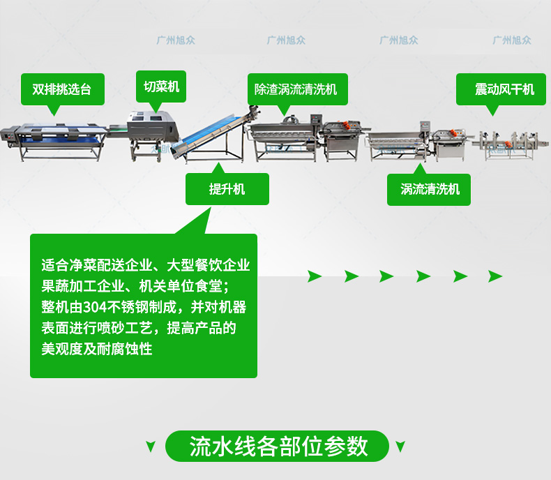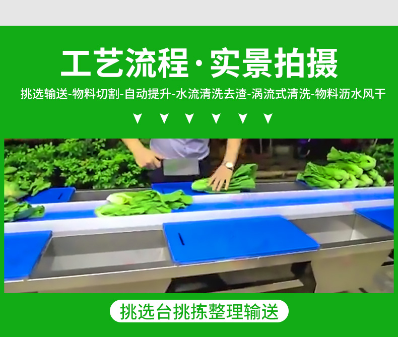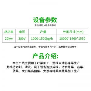 名稱全自動大型葉菜清洗線 電源20kw 功率380V 產(chǎn)量1000-1500kg/h 尺寸18000mm*1460mm*1550mm 重量請資詢銷售員 規(guī)格請資詢銷售員 其他