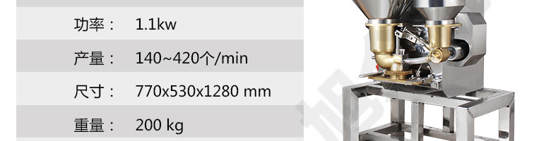 名稱SZ-602包心肉丸機(jī) 電源220/380V(見機(jī)器銘牌) 功率1.1kw 產(chǎn)量140-420個/分鐘 尺寸770*530*1280mm 重量200kg 規(guī)格 其他