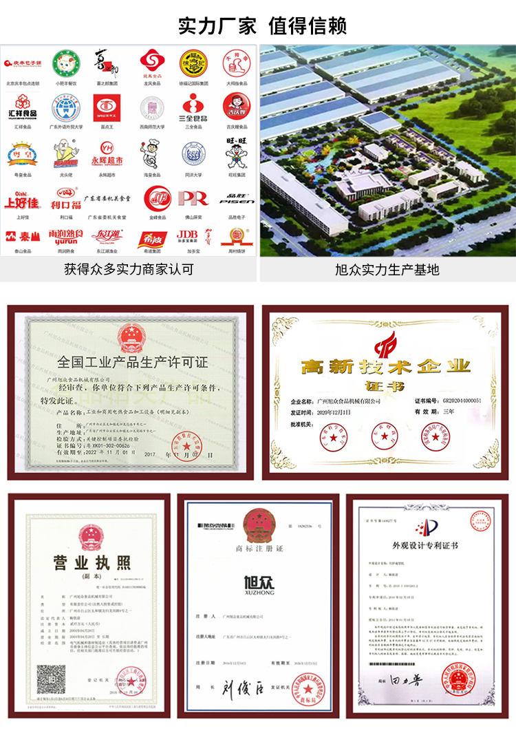 廣州旭眾食品機(jī)械有限公司是一家集科研開發(fā),生產(chǎn)設(shè)計(jì),營銷服務(wù)為一體的現(xiàn)代化生產(chǎn)企業(yè)?,F(xiàn)代化生產(chǎn)車間,精湛制造技術(shù),所產(chǎn)機(jī)械歷經(jīng)市場重重考驗(yàn),不斷贏得海內(nèi)外客戶的贊譽(yù)。