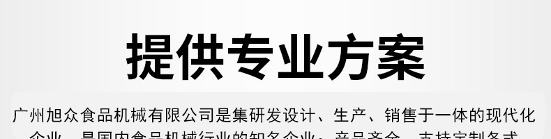 廣州旭眾食品機(jī)械有限公司是一家集科研開發(fā),生產(chǎn)設(shè)計(jì),營銷服務(wù)為一體的現(xiàn)代化生產(chǎn)企業(yè)?,F(xiàn)代化生產(chǎn)車間,精湛制造技術(shù),所產(chǎn)機(jī)械歷經(jīng)市場重重考驗(yàn),不斷贏得海內(nèi)外客戶的贊譽(yù)。