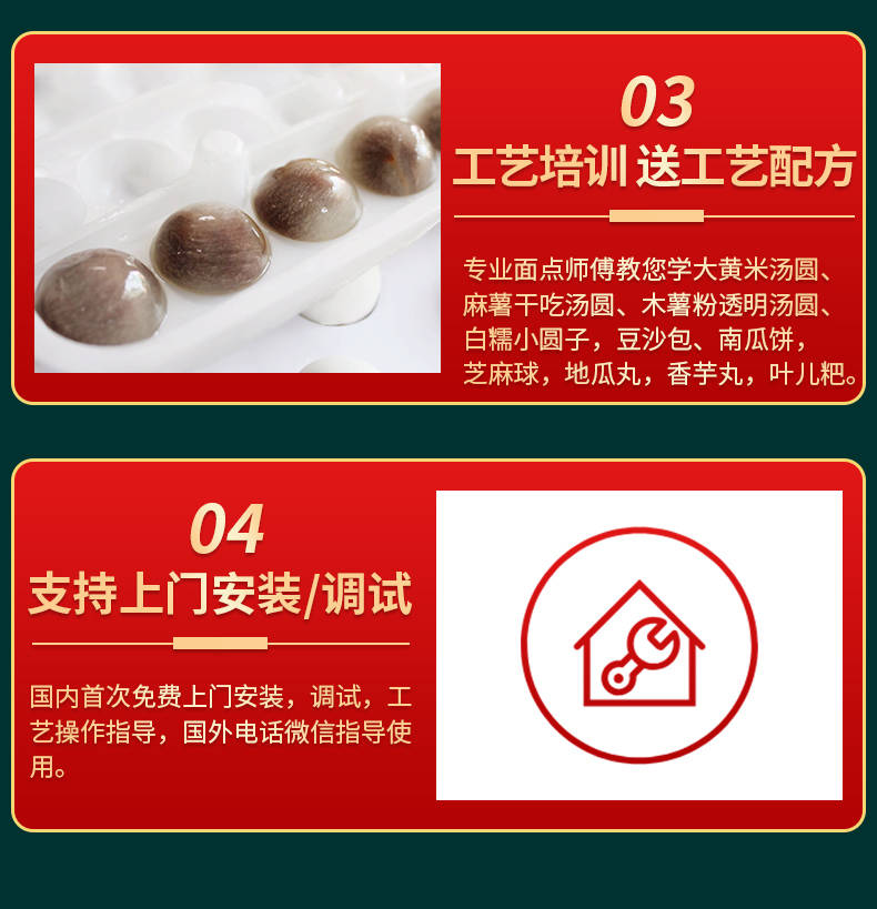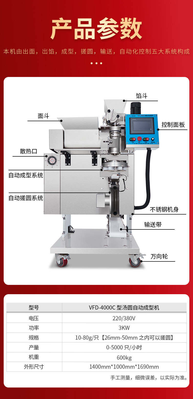 VFD-4000型湯圓自動成型排盤一體機,本機依外皮及餡料的種類不同,可制作湯圓、豆沙包、南瓜餅、奶黃包、含餡饅頭、玉兔包等包餡食品的設(shè)備。工作效率高、相當于8-12個工人同時制作湯圓,真正低收入、高收效、省錢省工。適合用于各種工作場所。免費上門安裝,贈送工藝
