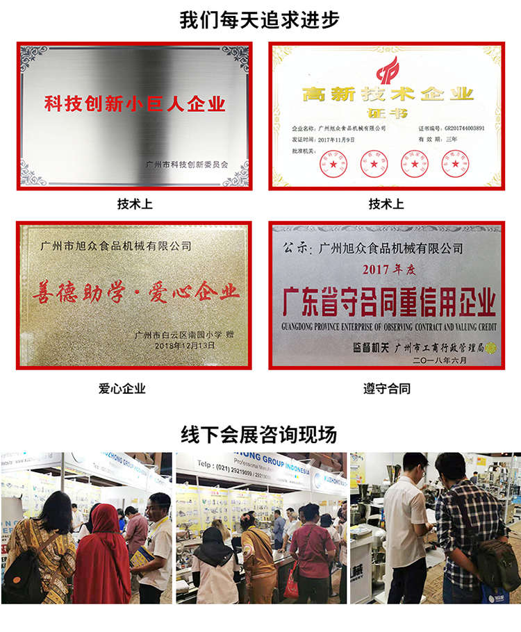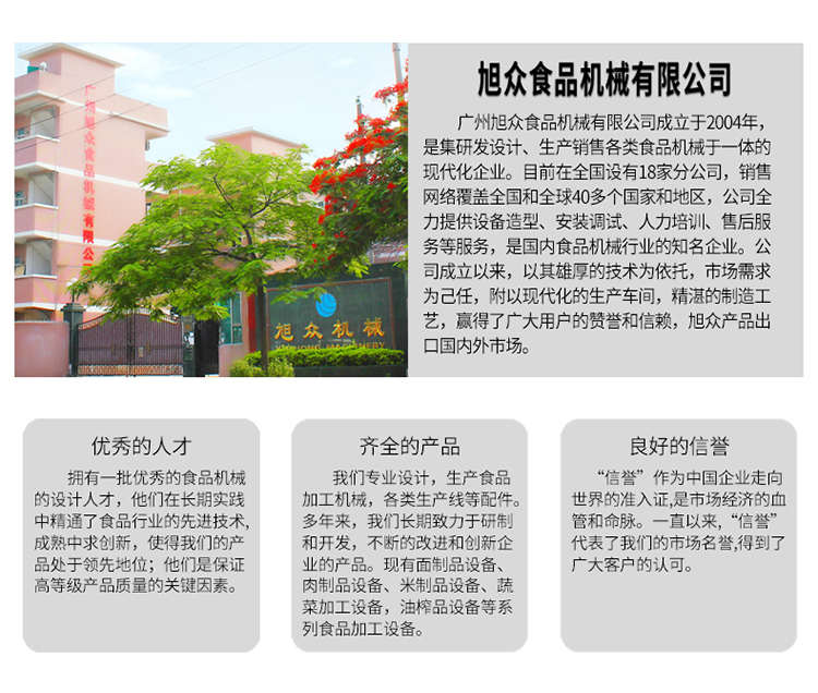 廣州旭眾食品機(jī)械有限公司是一家集科研開發(fā),生產(chǎn)設(shè)計(jì),營銷服務(wù)為一體的現(xiàn)代化生產(chǎn)企業(yè)。現(xiàn)代化生產(chǎn)車間,精湛制造技術(shù),所產(chǎn)機(jī)械歷經(jīng)市場(chǎng)重重考驗(yàn),不斷贏得海內(nèi)外客戶的贊譽(yù)。