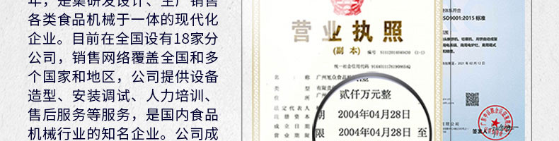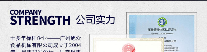 廣州旭眾食品機(jī)械有限公司是一家集科研開(kāi)發(fā),生產(chǎn)設(shè)計(jì),營(yíng)銷(xiāo)服務(wù)為一體的現(xiàn)代化生產(chǎn)企業(yè)?,F(xiàn)代化生產(chǎn)車(chē)間,精湛制造技術(shù),所產(chǎn)機(jī)械歷經(jīng)市場(chǎng)重重考驗(yàn),不斷贏得海內(nèi)外客戶(hù)的贊譽(yù)。