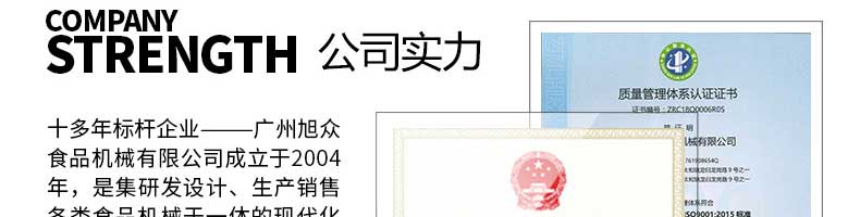 廣州旭眾食品機械有限公司是一家集科研開發(fā),生產(chǎn)設計,營銷服務為一體的現(xiàn)代化生產(chǎn)企業(yè)?,F(xiàn)代化生產(chǎn)車間,精湛制造技術(shù),所產(chǎn)機械歷經(jīng)市場重重考驗,不斷贏得海內(nèi)外客戶的贊譽。