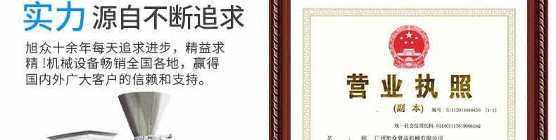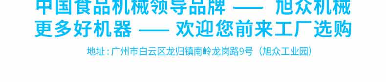 廣州旭眾食品機械有限公司是一家集科研開發(fā),生產(chǎn)設計,營銷服務為一體的現(xiàn)代化生產(chǎn)企業(yè)?,F(xiàn)代化生產(chǎn)車間,精湛制造技術,所產(chǎn)機械歷經(jīng)市場重重考驗,不斷贏得海內(nèi)外客戶的贊譽。