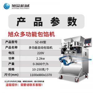 名稱SZ-69型多功能自動(dòng)包餡機(jī) 電源220V 功率2.2KW 產(chǎn)量0-3600個(gè)/h 尺寸1100X880X1370mm 重量請(qǐng)咨詢銷售員 規(guī)格10-250克/個(gè) 其他