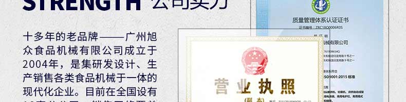 廣州旭眾食品機械有限公司是一家集科研開發(fā),生產(chǎn)設計,營銷服務為一體的現(xiàn)代化生產(chǎn)企業(yè)?,F(xiàn)代化生產(chǎn)車間,精湛制造技術,所產(chǎn)機械歷經(jīng)市場重重考驗,不斷贏得海內外客戶的贊譽。