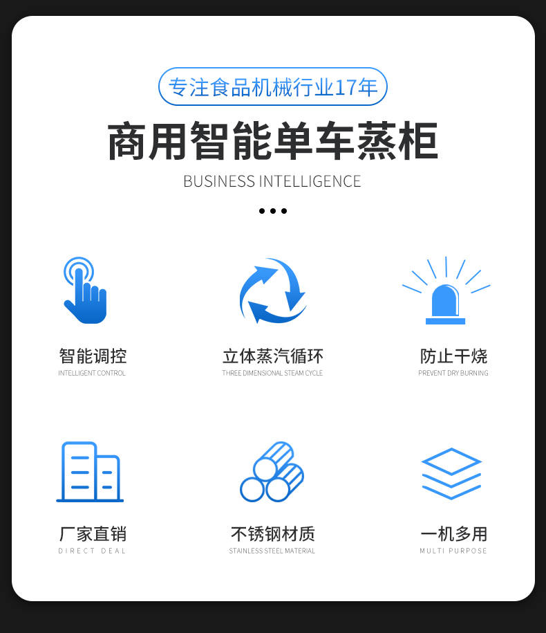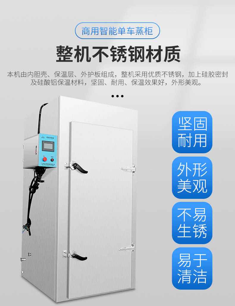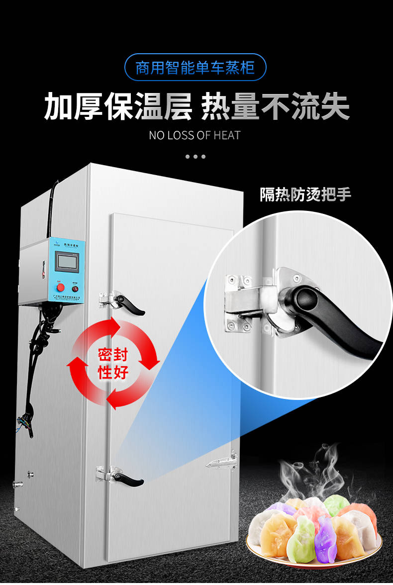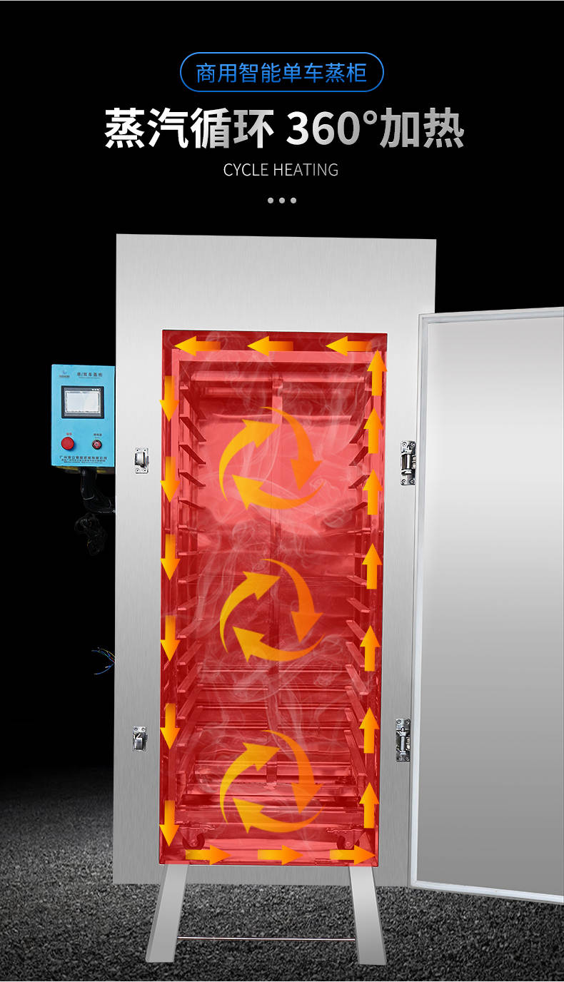 單車蒸柜,整機不銹鋼材質本機由內(nèi)膽殼、保溫層、外護板組成,整機采用優(yōu)質不銹鋼,加上硅膠密封及硅酸鋁保溫材料,堅固、耐用、保溫效果好,外形美觀。循環(huán)均勻發(fā)熱,專門用于發(fā)熱管干燒空氣,溫度任意調節(jié),讓食物口感怡到好吃