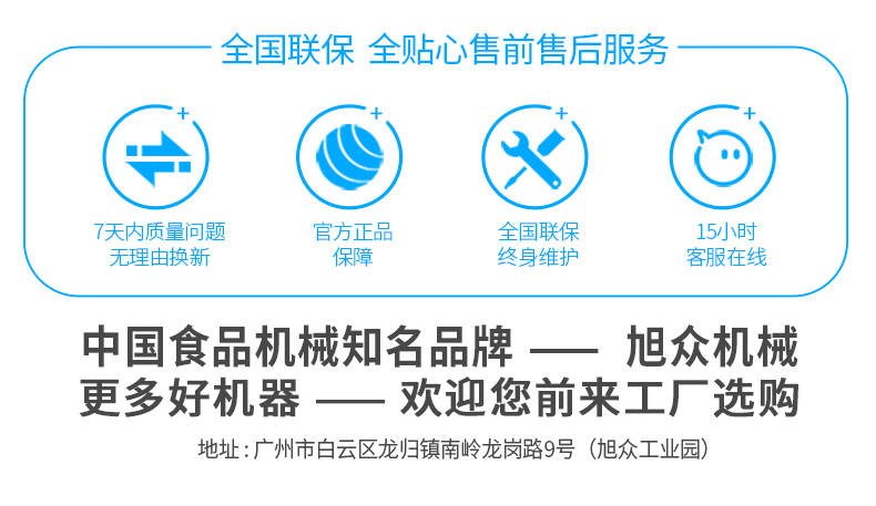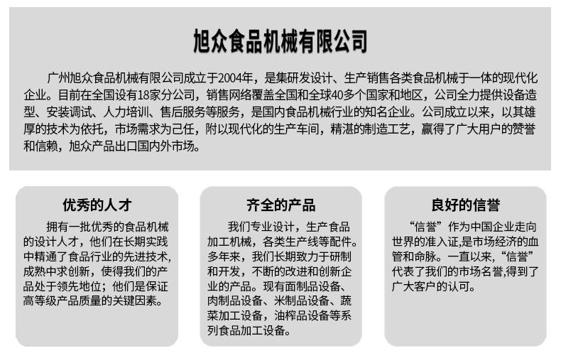 廣州旭眾食品機械有限公司是一家集科研開發(fā),生產(chǎn)設計,營銷服務為一體的現(xiàn)代化生產(chǎn)企業(yè)?,F(xiàn)代化生產(chǎn)車間,精湛制造技術,所產(chǎn)機械歷經(jīng)市場重重考驗,不斷贏得海內(nèi)外客戶的贊譽。